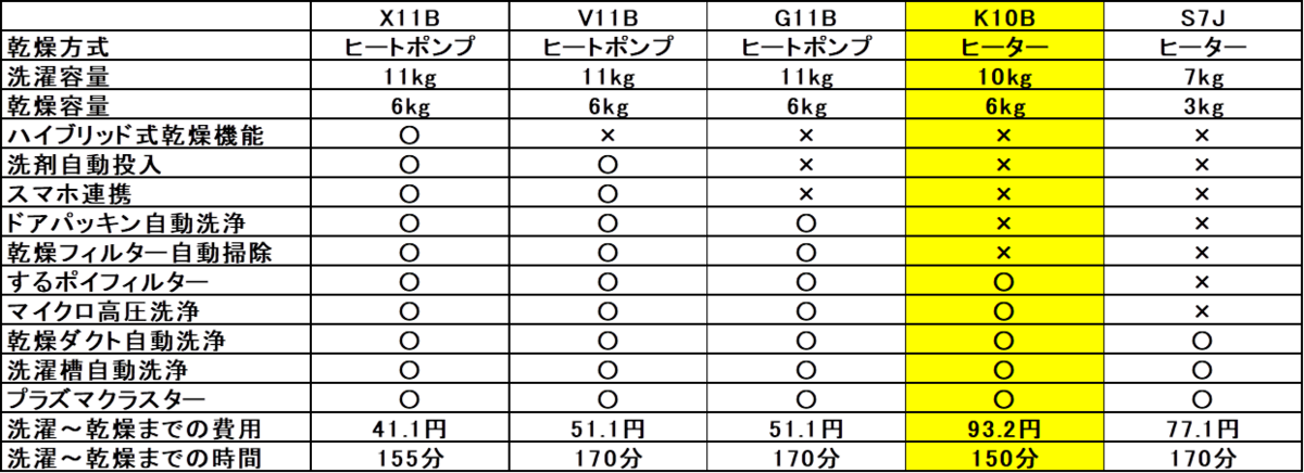 1つ上のG11Bと比べてもカタログスペックで1回40円程度差が出る。もし毎日洗濯~乾燥まですると1か月1,200円、1年で15,000円、5年で7.5万円の差がでるが、G11Bとの本体の値差は大体3~5万円程度なので、長期的に考えると、大体4年目くらいでK10BよりもG11B以上の方がお得になる
